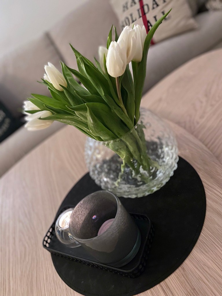 På tal om krispigt så kom dottern hem med dessa fina vita krispiga tulpanerna till mig ikväll ♡ Älskade tjej, så gulligt av henne att tänka på sin krassliga mamma! Det livar definitivt upp med en fräsch bukett på bordet och en massa tända ljus i vardagsrummet.