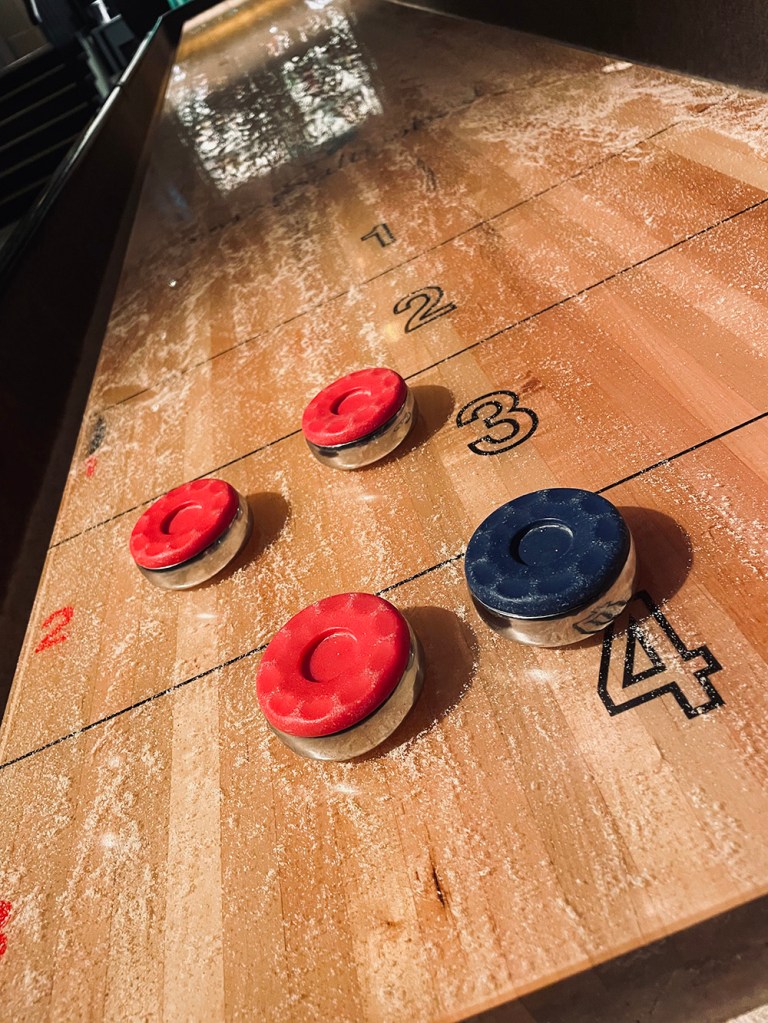 Efter middagen på kvällen blev det spontant en pingismatch. Med klackar 🙂 Men det gick finfint ändå, haha! Och eftersom det inte var min man som vann ville han ha revansch med Shuffleboard, där det tyvärr (för honom) gick likadant.
