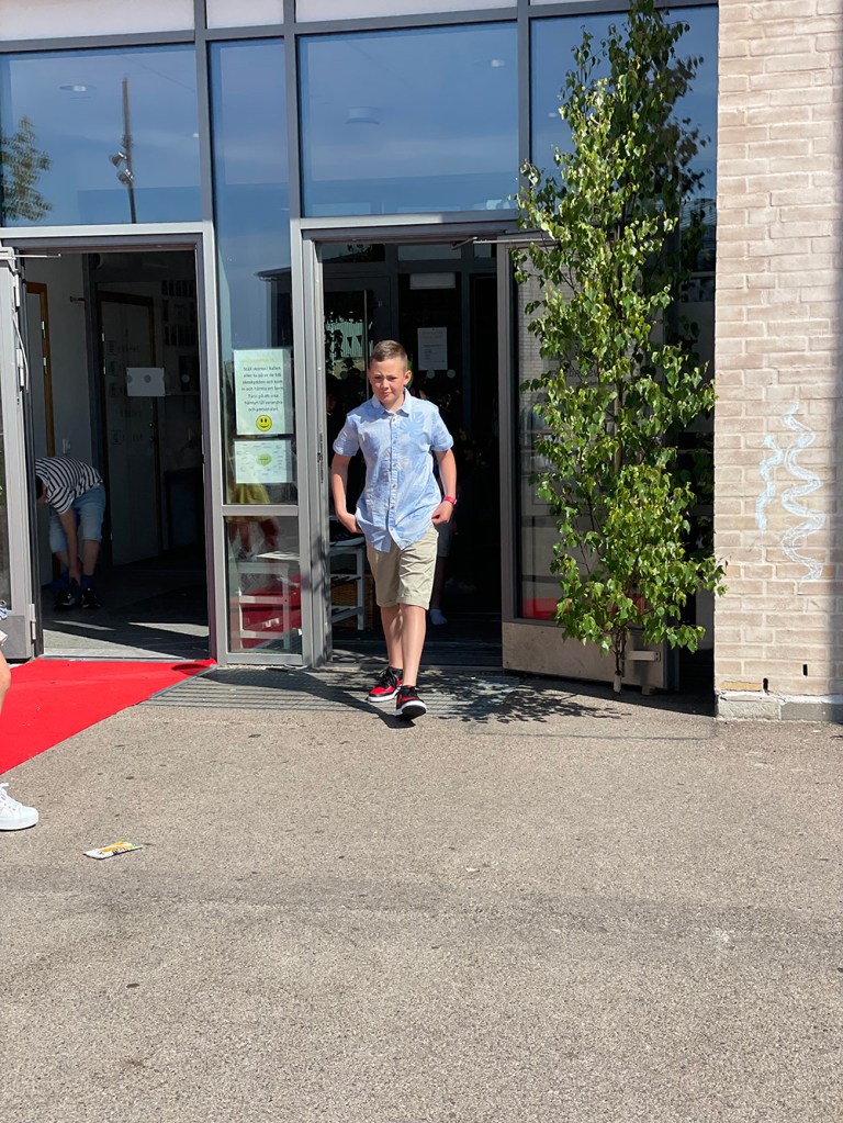 Så här klev R ut från ”sin” skola för sista gången. Till hösten väntar nya utmaningar, ny skola, nya klasskompisar och nya lärare. Spännande! Men som tur är är det flera av killarna från ”gamla” klassen som spelar i samma fotbollslag som R så han kommer ändå att träffa dem.