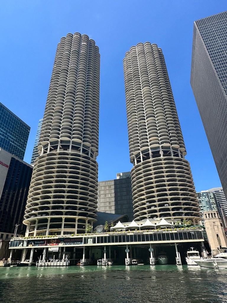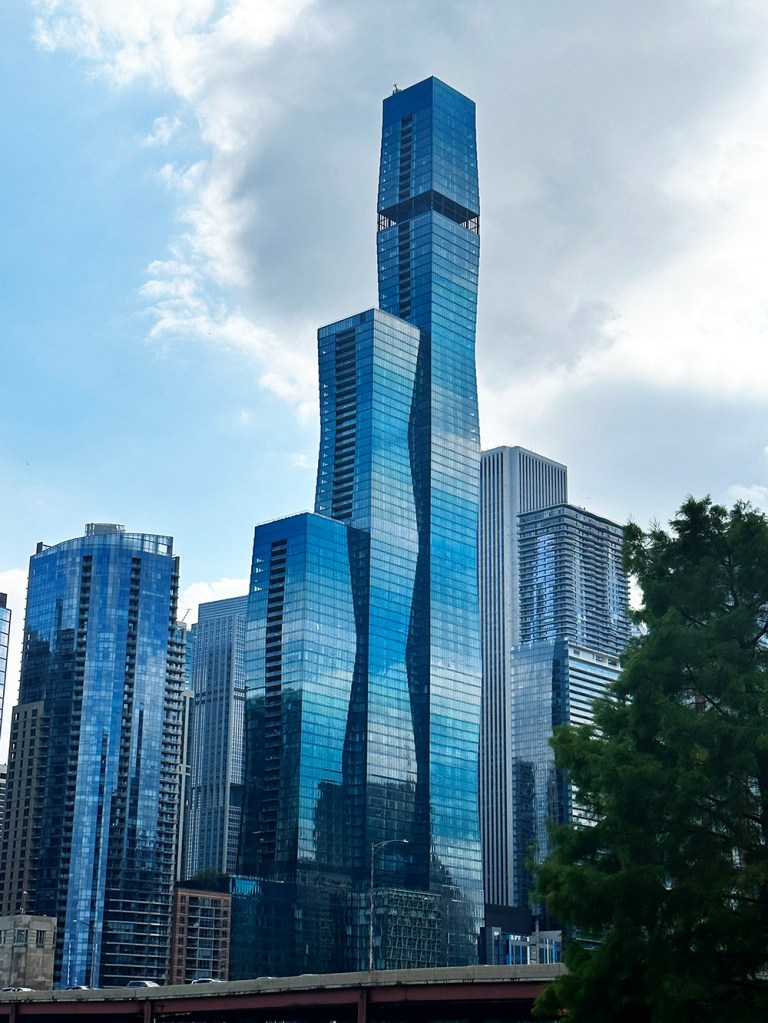 Kolla in husen alltså! St. Regis Chicago, till vänster nedan, hette tidigare Wanda Vista Tower och är ett lyxigt hotell. Det är en 101 våningar hög skyskrapa, eller ja det är ju tre sammankopplade torn i olika höjder. Det böljande utseendet förstärks av att glaset också har olika nyanser i omväxlande mönster. Häftigt!