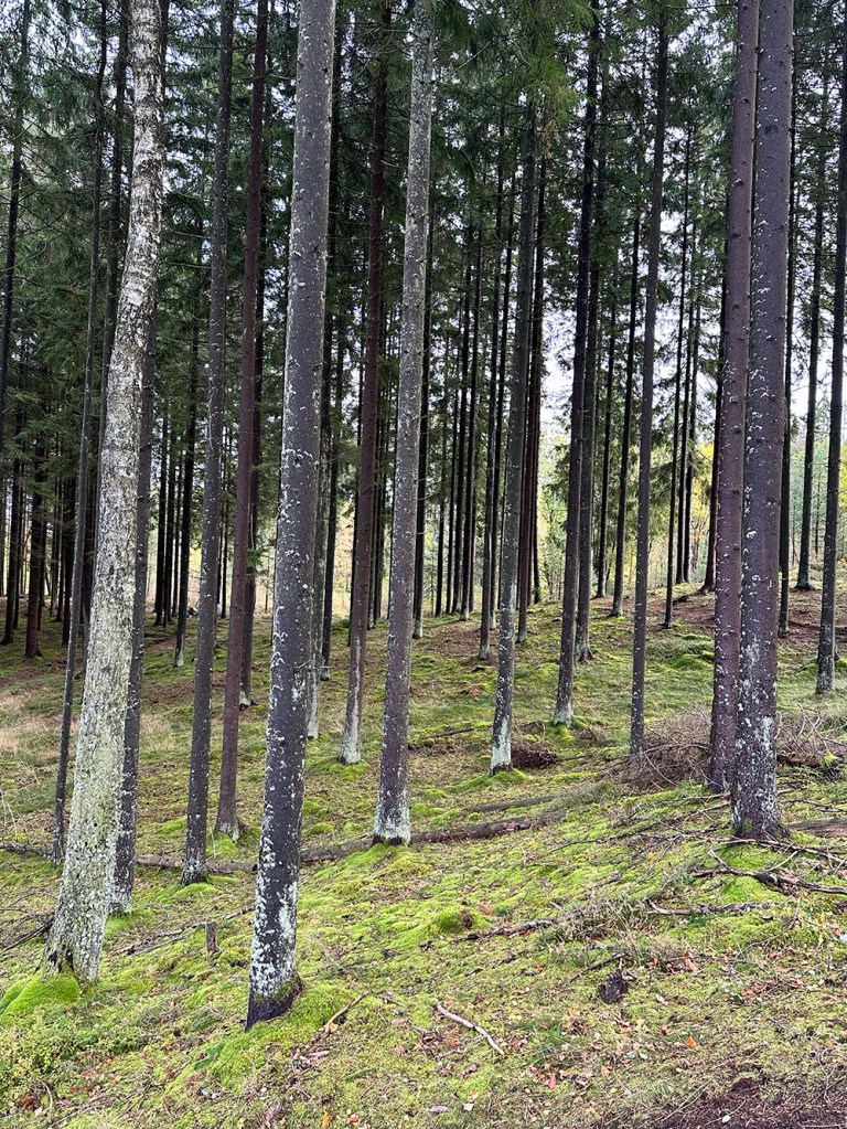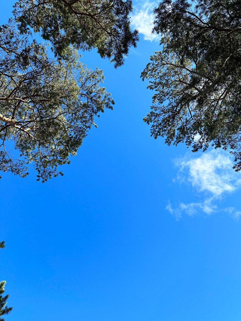 Så veckans första bild blir en bild jag egentligen tog förra veckan när det nästan var helt blå himmel. Gick en liten skogsrunda med den fyrbenta fluffiga och såg himlen mellan trädtopparna. Just nu är det inte ofta annars det är blå himmel tycker jag – mest regn och rusk och grå himmel.