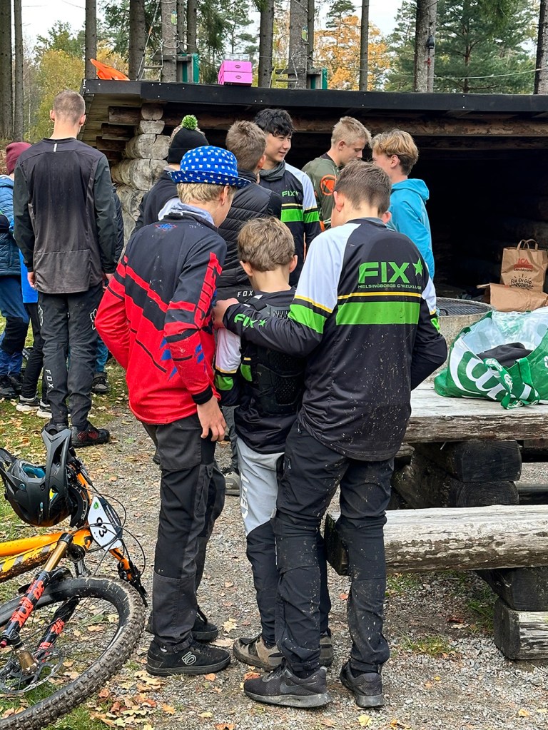 Det var en lång dag i naturen. Helt ok egentligen, bortsett från att jag kände mig otroligt bortkommen till att börja med. Kände ingen, visste inte hur det gick till och det var väldigt mycket väntan. Först var det träning för grabbarna av lederna de skulle tävla i (på?). När tävlingen sedan började var det ytterligare lång väntan då alla tävlande skulle ta sig upp till toppen först och det tog ca 20-30 minuter varje gång. Då stod vi, publiken, någonstans ute i skogen och väntade på att de skulle komma nedsusandes igen. Och när de väl kom susade de förbi på ett par sekunder.