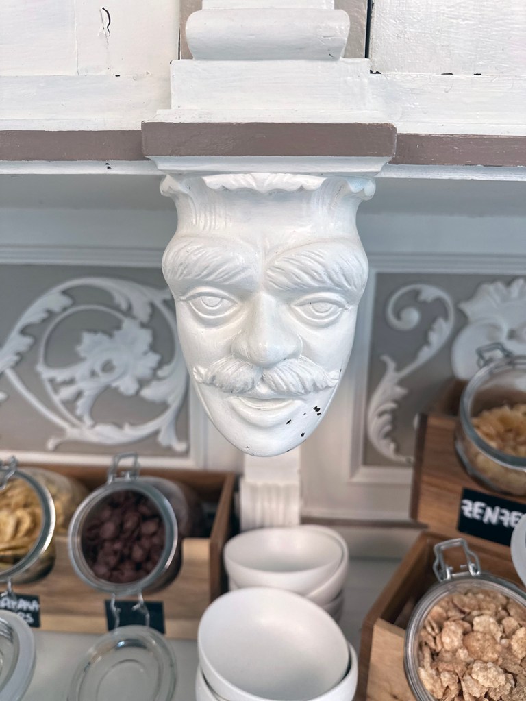 I Italien fortsatte det med ett läskigt ansikte på en hylla i frukostmatsalen. Faktiskt två, för de var två stycken likadana på motsatt sida av hyllan… Sedan en prydnad på en vägg ovanför en dörr som bara får mig att tänka på Medusa med läskiga ögon.