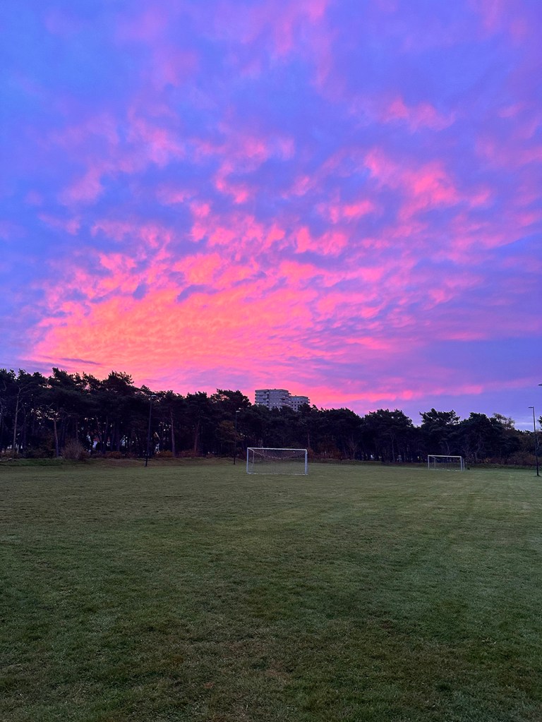 Och så en morgonvy helt utan filter. Ibland kan naturen verkligen vara magisk! Hörde en gång för mååånga år sedan att rosa himmel betyder föroreningar i atmosfären. Försökte googla det nu och som jag förstår det kan det rosa ljuset förstärkas av höga halter luftburna partiklar i atmosfären, men att det främst handlar om att ljuset tar en längre väg genom atmosfären innan det når oss när det är soluppgång/solnedgång. Att det inte är samma färg på himlen varje morgon beror på skillnader i atmosfären.