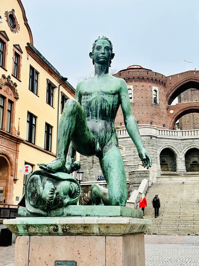 Och inte alls långt från Magnus Stenbock finns en staty av David. En grotesk sådan (enligt min mening) där en naken (varför är nästan alla statyer nakna???) David med (vad jag gissar är) Goliats huvud.. Trots att statyn står supercentralt har jag på riktigt aldrig lagt märke till den!