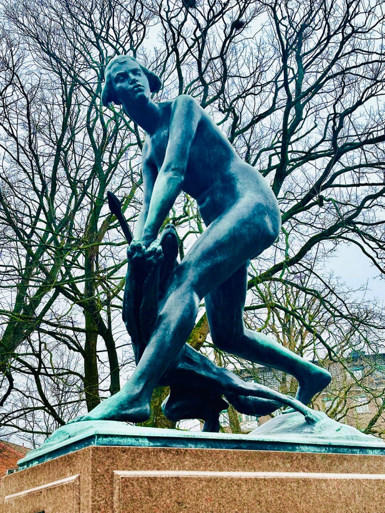 Av en slump gick jag också förbi statyn ”Jakt” i en park. Tycker att även den statyn ser lite ”vildsint” ut även om det kanske eg bara är en taggad hund som ska få jaga. Men återigen, varför är snubben naken??