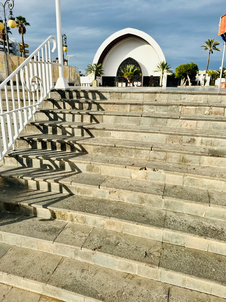 Hittade lite trappor på morgonpromenaden, passande nog, till Maddes fotopromenadtema. En ganska vanlig trappa i närheten av Temple Ecumenico El Salvador. En katolsk kyrka precis vid ett ”köpcentrum” innan man kommer till strandpromenaden.