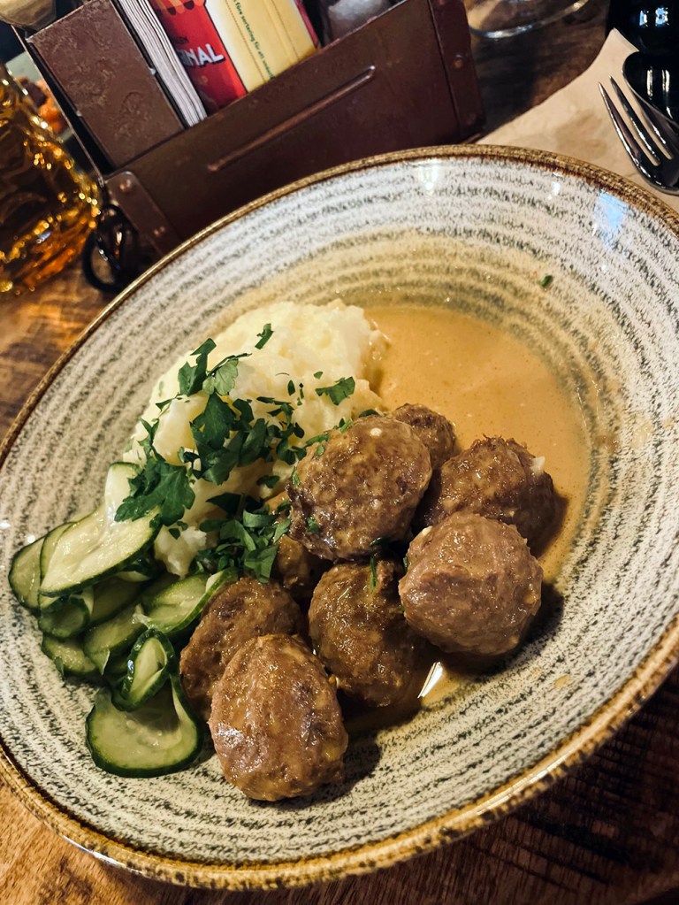 Menyn bestod av diverse förrätter serverade som en buffé med allt ifrån ceviche & krustader till pinsapizza & varm brie med fikonmarmelad. Huvudrätten var oxfilé (kalkonfilé för min del) & potatisgratäng med diverse såser & grönsaker. Desserten var en smarrig glassmarängtårta med nötter, bär och även dajm tror jag. Gott var det iaf!